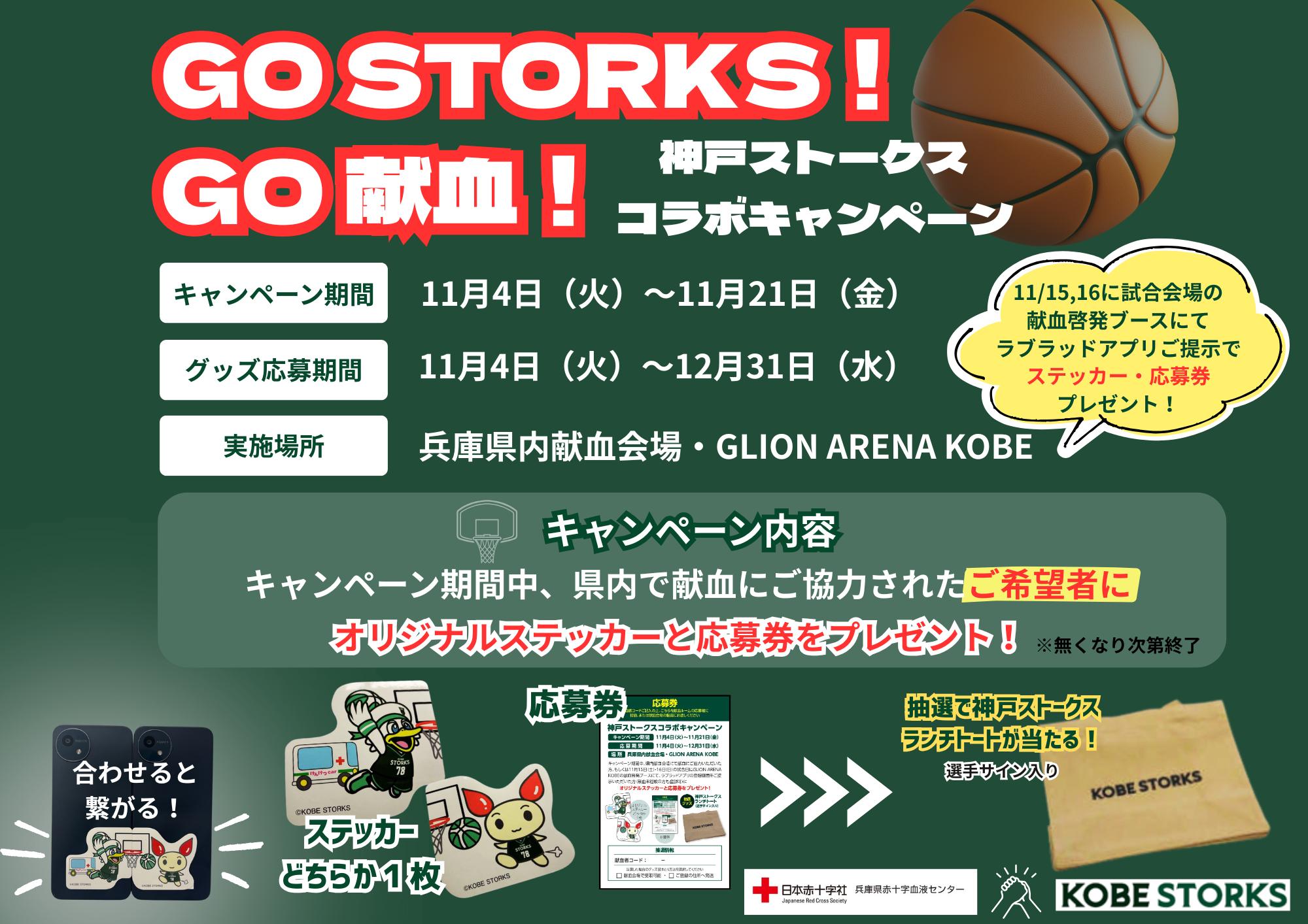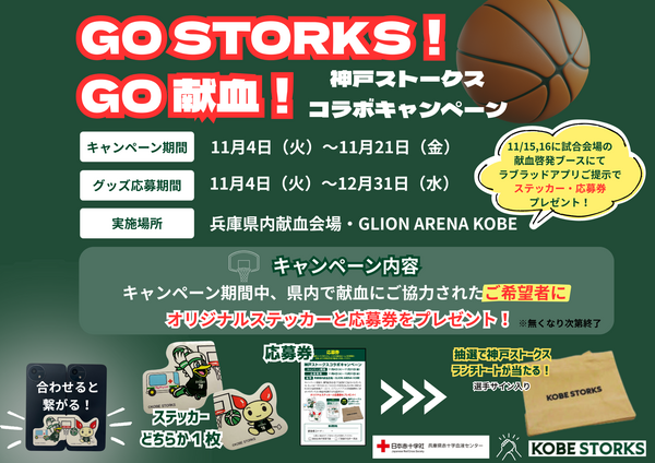 キャンペーン期間中に、兵庫県内にて献血にご協力いただいたご希望の方へ、オリジナルステッカー(ストーキーorけんけつちゃん)と神戸ストークスのグッズが当たる応募券をプレゼントいたします。または、11/15(土)・16(日)開催の岩手ビッグブルズ戦のホームゲーム会場「GLION ARENA KOBE(ジーライオンアリーナ神戸)」で設置される献血啓発ブースにて、「ラブラッド アプリ」の登録画面を