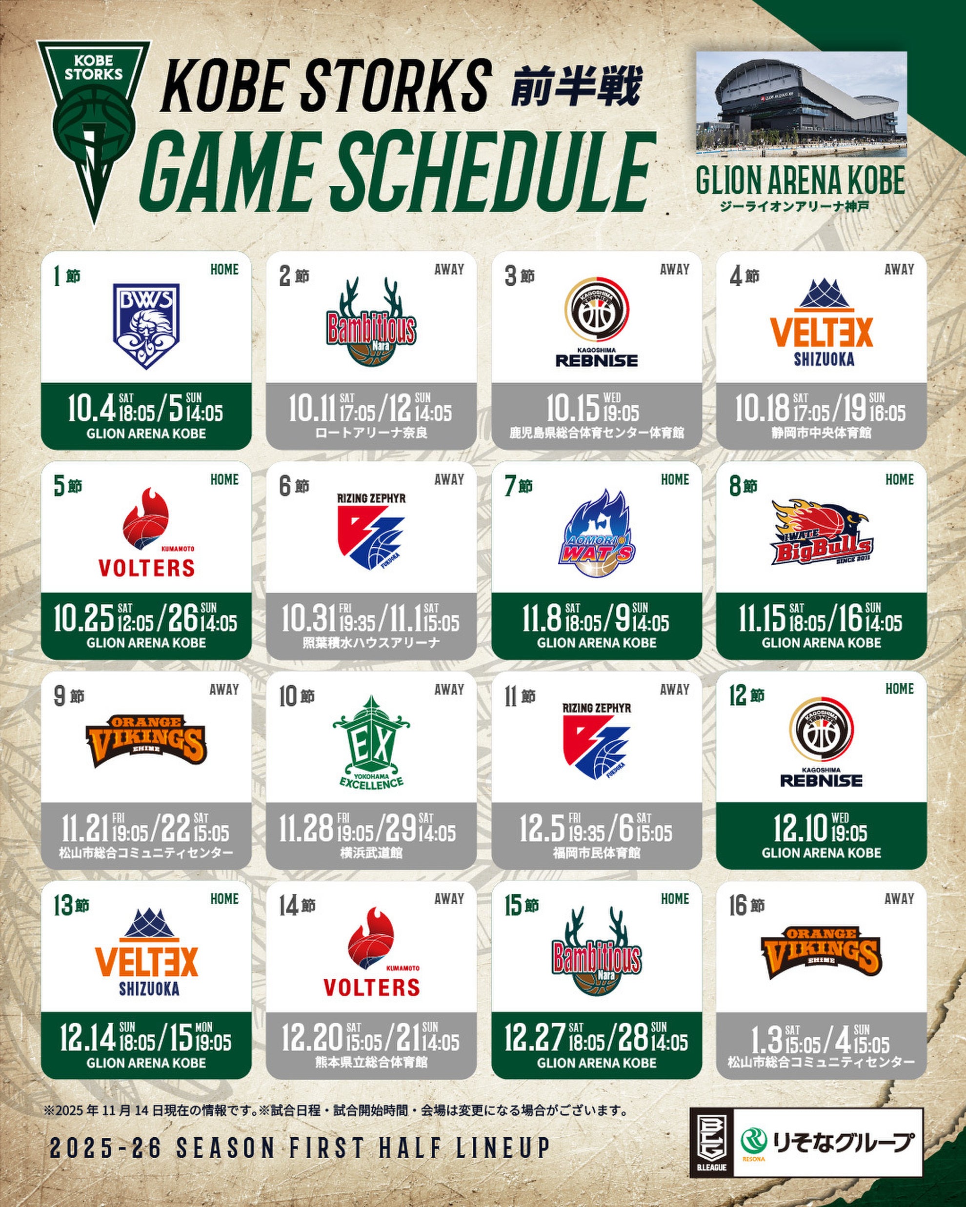 なお、本情報は2025年11月14日現在の情報です。試合開始時間・会場は変更となる場合がございます。
