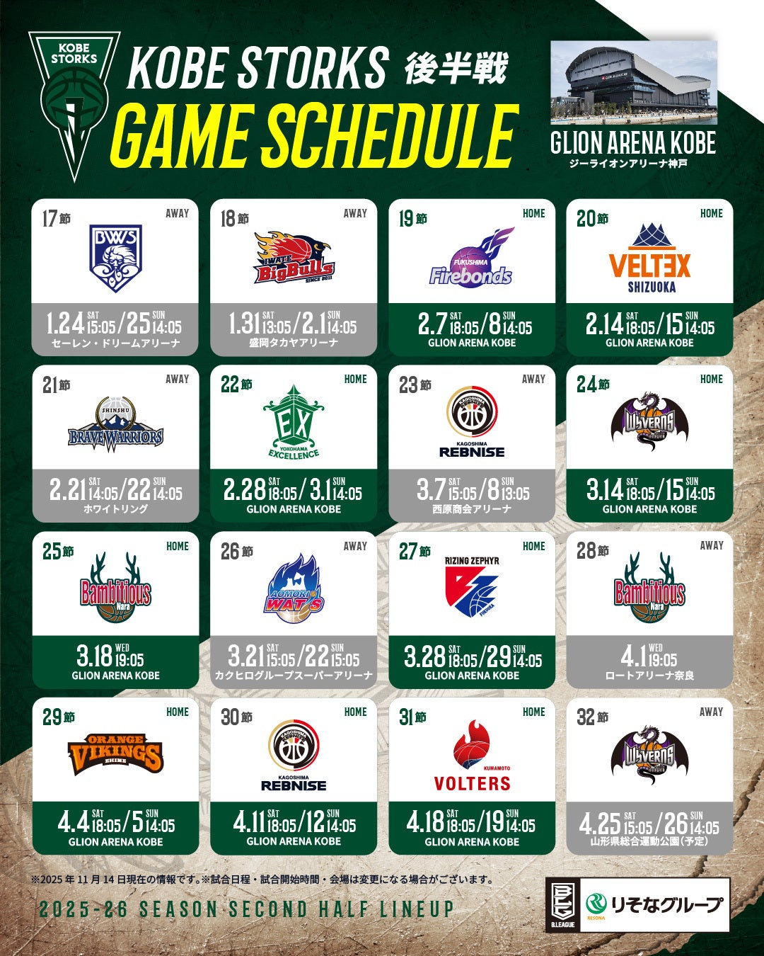 またあわせて第29節~第31節の神戸ストークス ホームゲームの試合時間もお知らせいたします。