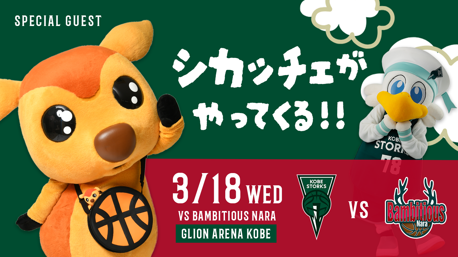 3月18日(水)に開催される vs バンビシャス奈良 の試合に、バンビシャス奈良のマスコット「シカッチェ」が来場します。